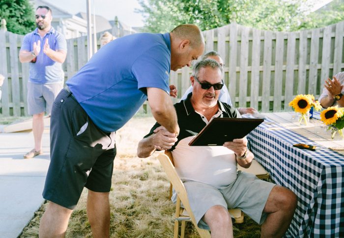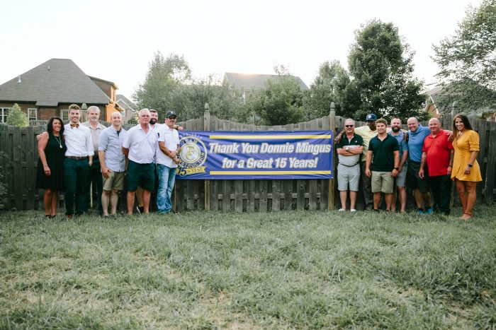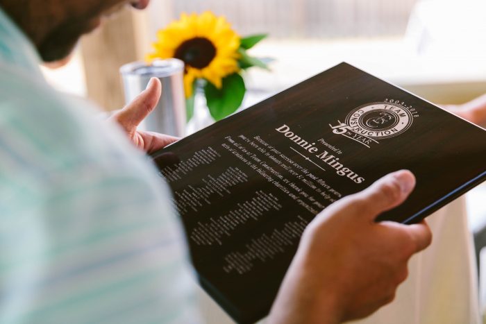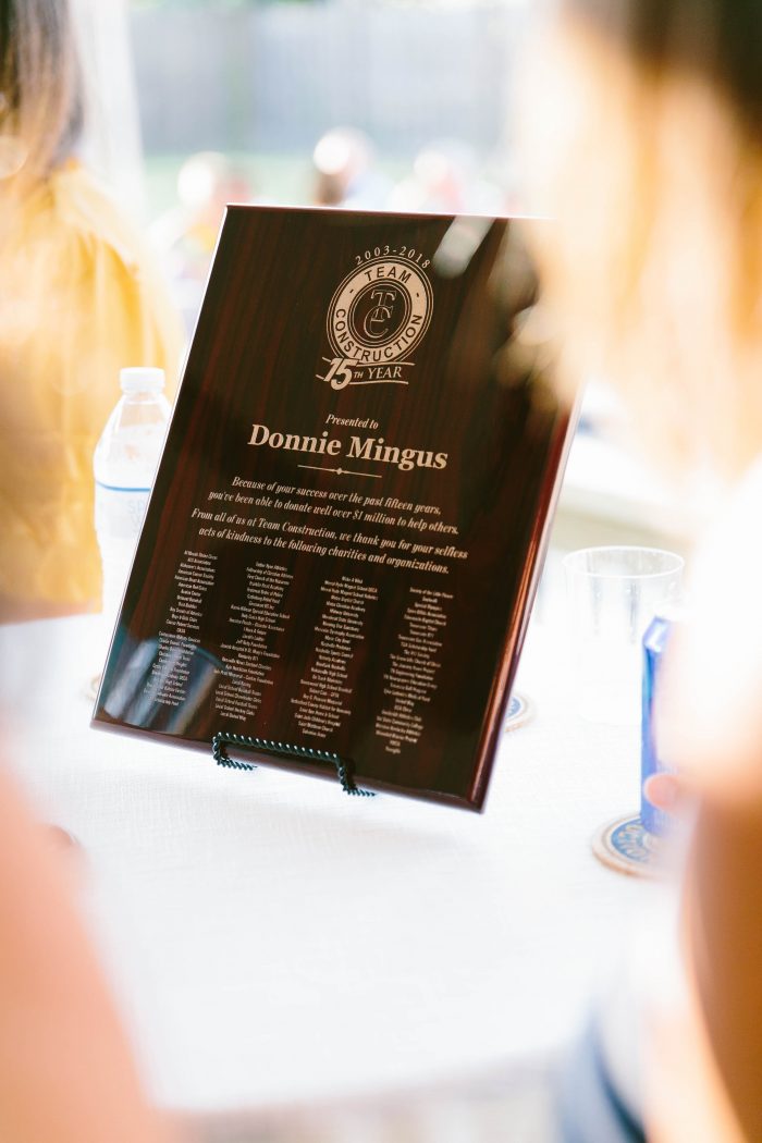 Team Construction celebrated it’s 15 Year Anniversary this July! We threw a little backyard barbeque party and surprised Donnie Mingus, founder and owner of Team Construction, with some good grub and crappy karaoke! It just so happened, a couple weeks before the party, Team Construction hit $1 million in donations to various charities and organizations. We were thrilled to get Donnie a plaque memorializing the huge accomplishment.